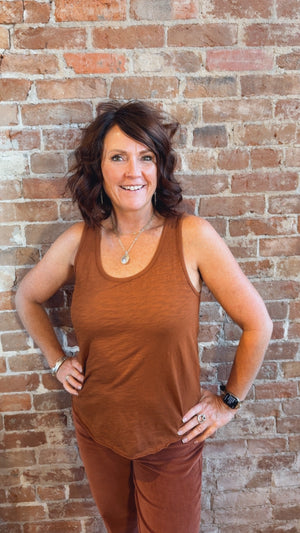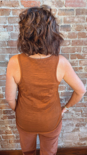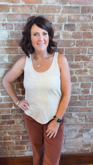 The Mododoc Curve Hem Slim Scoop Neck Tank (style 46F-A2179) is a casual yet polished everyday essential featuring a clean, slim silhouette with a classic scoop neckline and a subtly curved hem that adds modern shape and movement to the look. It’s crafted from 100 % cotton slub jersey, giving the tank a soft, breathable feel with a bit of texture and comfortable stretch suitable for all-day wear. The sleeveless, pull-on design and relaxed fit make it versatile for pairing with jeans, shorts, or skirts while keeping a laid-back, effortless style.