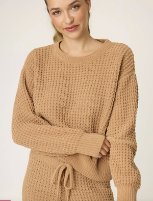 The P.J. Salvage Chenille Waffle Long Sleeve Top (RUCWLS) is a plush, lounge-worthy pullover that epitomizes cozy sophistication. It’s crafted from a100% polyester “cozy chenille melange waffle” knit, which gives it a soft, velvety texture with a subtle raised grid pattern. The design features a relaxed fit, a classic crew neckline, and banded cuffs, making it easy to throw on for slow mornings or curl up in by the fire. The waffle structure adds visual interest and dimension without bulk, while the chenille fiber ensures a luxe, fuzzy feel that’s both warm and breathable.