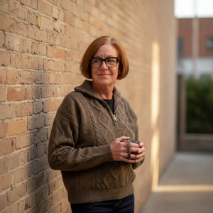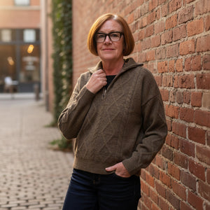 This half‑zip sweater from Woven Heart (style “WH16F”) offers a streamlined yet relaxed layering piece featuring a high stand‑collar with a half‑zip front that lets you adjust the neckline from snug to open depending on your mood or temperature. It has long sleeves and a length that falls around the hip, giving it a clean and versatile silhouette. Fabric‑wise while exact specs are not listed for this exact style, similar Woven Heart sweaters are crafted from soft knit blends (commonly acrylic‑ or polyester‑based) that offer easy care, comfortable drape, and light warmth. The design blends subtle sporty elements (zip neckline) with refined knitwear styling, making it an ideal transitional‑season piece—pair it with straight jeans for everyday ease or layer it under a blazer for a casual‑chic touch.